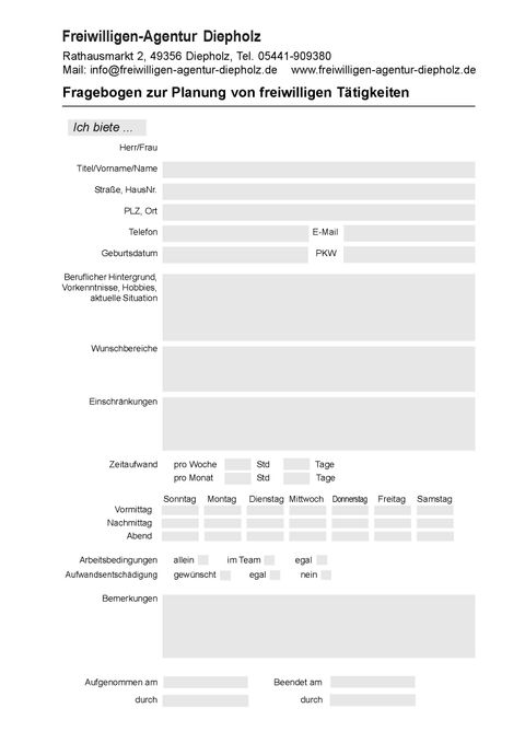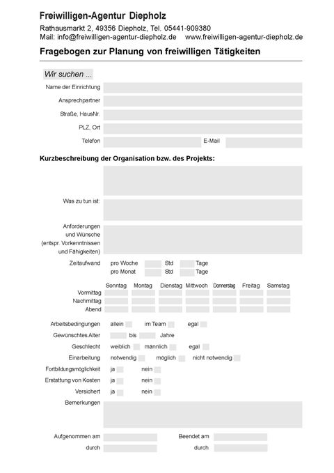 Wenn Sie für Ihren Verein, Institution, Einrichtung oder als Einzelperson ehrenamtliche Hilfe benötigen, drucken Sie bitte das Formular aus und senden es ausgefüllt an die Freiwilligen-Agentur.